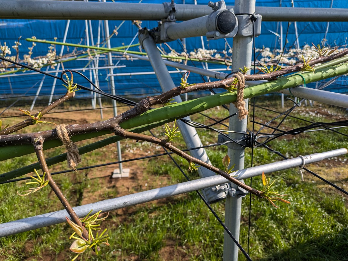 梨の摘蕾作業がひと通り終わりました。花を咲かせたくないところの蕾を潰していきます。貯蔵養分を無駄にしないようにと、蕾を潰して花を咲かせないようにして葉芽を伸ばすことが目的です。摘蕾の前後の様子です。品種は、あきあかり。