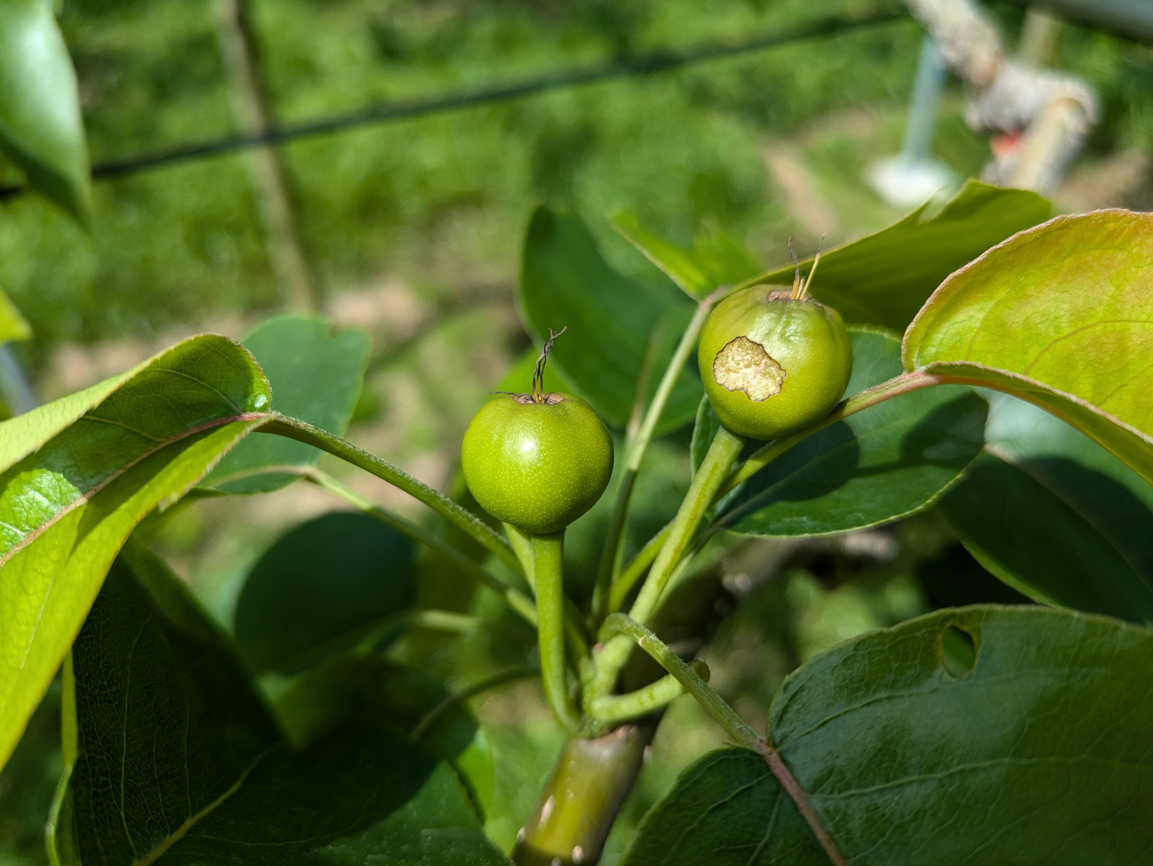 梨の予備摘果はひと通り終わりました。未成木園(幼木園)には、豊水はありません。未成木園は、雹害と害虫の被害果が成木園に比べ目立ちました。害虫はスズメガの幼虫とシャクトリ虫を何匹か捕殺しました。体調も2~3cmになっていて殺虫剤では効果が?で、見つけ次第捕殺するしかないです。着果量は成木になったことを想定すると2割にも満たない状況です。面積も成木園の3割弱です。この園の収穫量は計算できません。