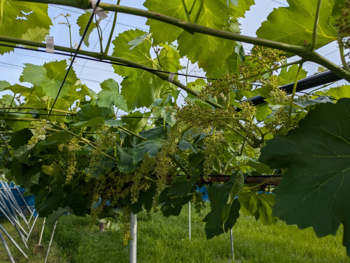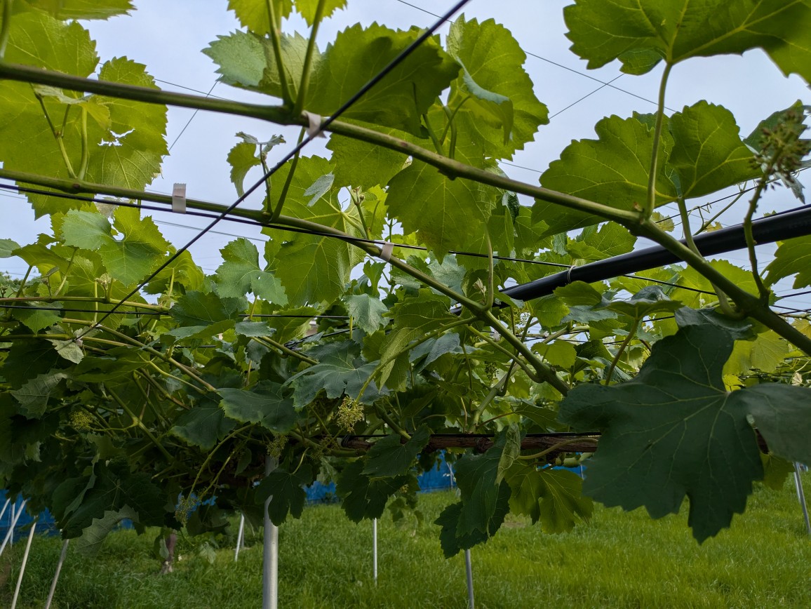 花粉採集、交配等キウイの仕事が忙しくて葡萄の作業が遅れています。開花が始まっているのに房づくりが追いつかない状態です。新梢の誘引もしなければならないのですが、房づくり優先です。房づくり前と後です。品種はBKシードレス。