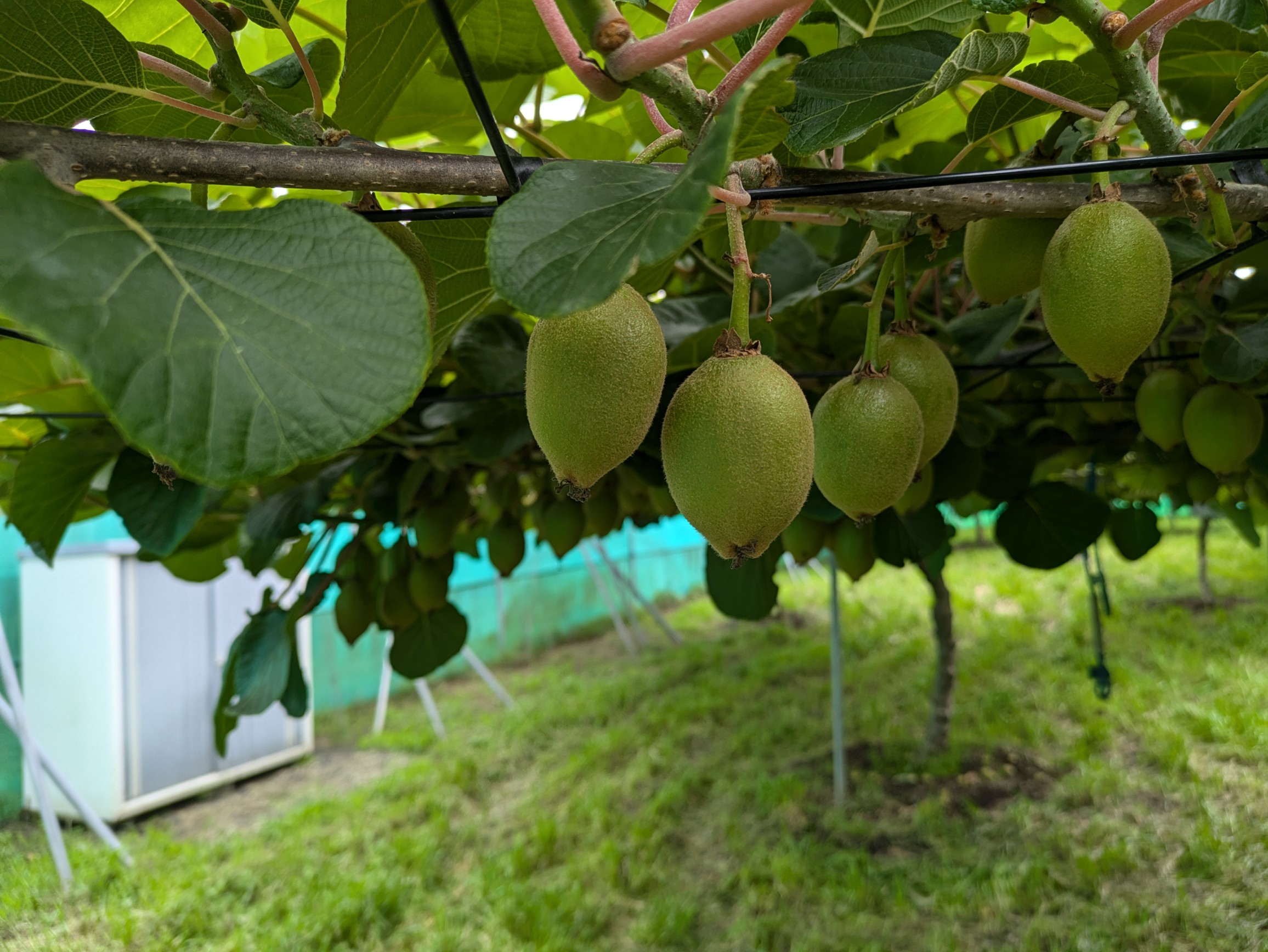 キウイフルーツの夏季管理講習会と圃場巡回検討会が部員と関係機関19名の参加で行われました。近年の温暖化の影響で、夏の強い日差しを避ける為に冬季剪定で枝を多く残す必要があり、枝の少ない所はこれからの時期に新梢を誘引して、果実に直射日光が当たらないようにする等の処置が必要になってきます。写真は栽培が増えてきた東京ゴールド(当園にはありません)。