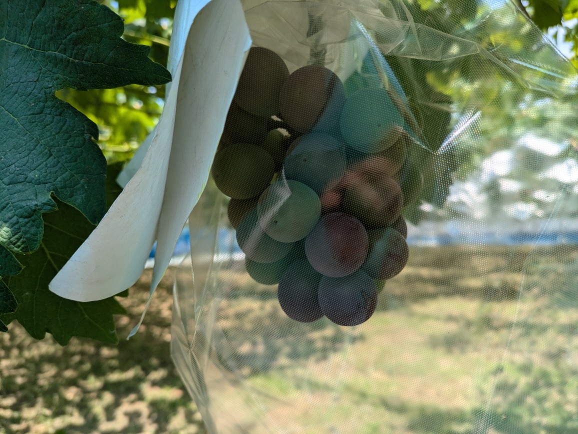 葡萄にトビ玉が入ってきました。透明の果実袋に日焼け防止の傘をかけています。今迄の紙の袋を破かなくても着色の進行がわかりますが、日焼けに弱いので注意が必要です。写真は藤稔。