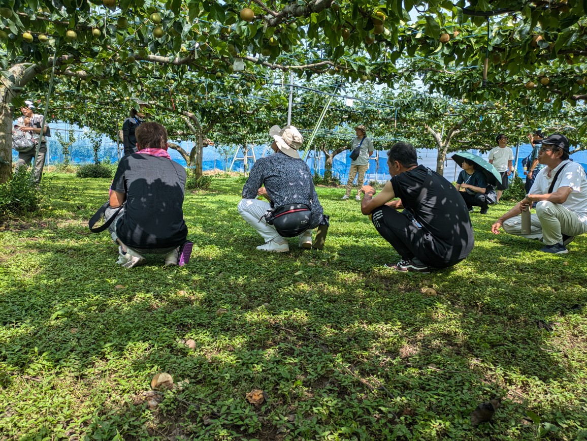 10日11日で埼玉県、群馬県方面に1泊2日の視察研修旅行に行ってきました。1日目は埼玉県の農業技術センターで花粉樹のネパール梨の品種試験と幸水の平行主枝に着果させる試験樹。花粉採集時に、脚立に乗って花を摘まむのではなく、長い竿の先にブラシ付いていてブラシを回転させて花を落とす機械を見ました。その後梨農家に行きましたが、ハダニに対して天敵を導入して、この5年間はダニ剤を散布しなくても、ハダニの被害を抑えられたのが、今年は6月から猛暑でいっぺんにハダニが増殖し被害甚大となっていました。埼玉県だけではなく今年は早くからの猛暑で、どこでもハダニの発生が多く被害が拡大しそうです。ハダニの被害が大きい木の梨は売り物になりません。