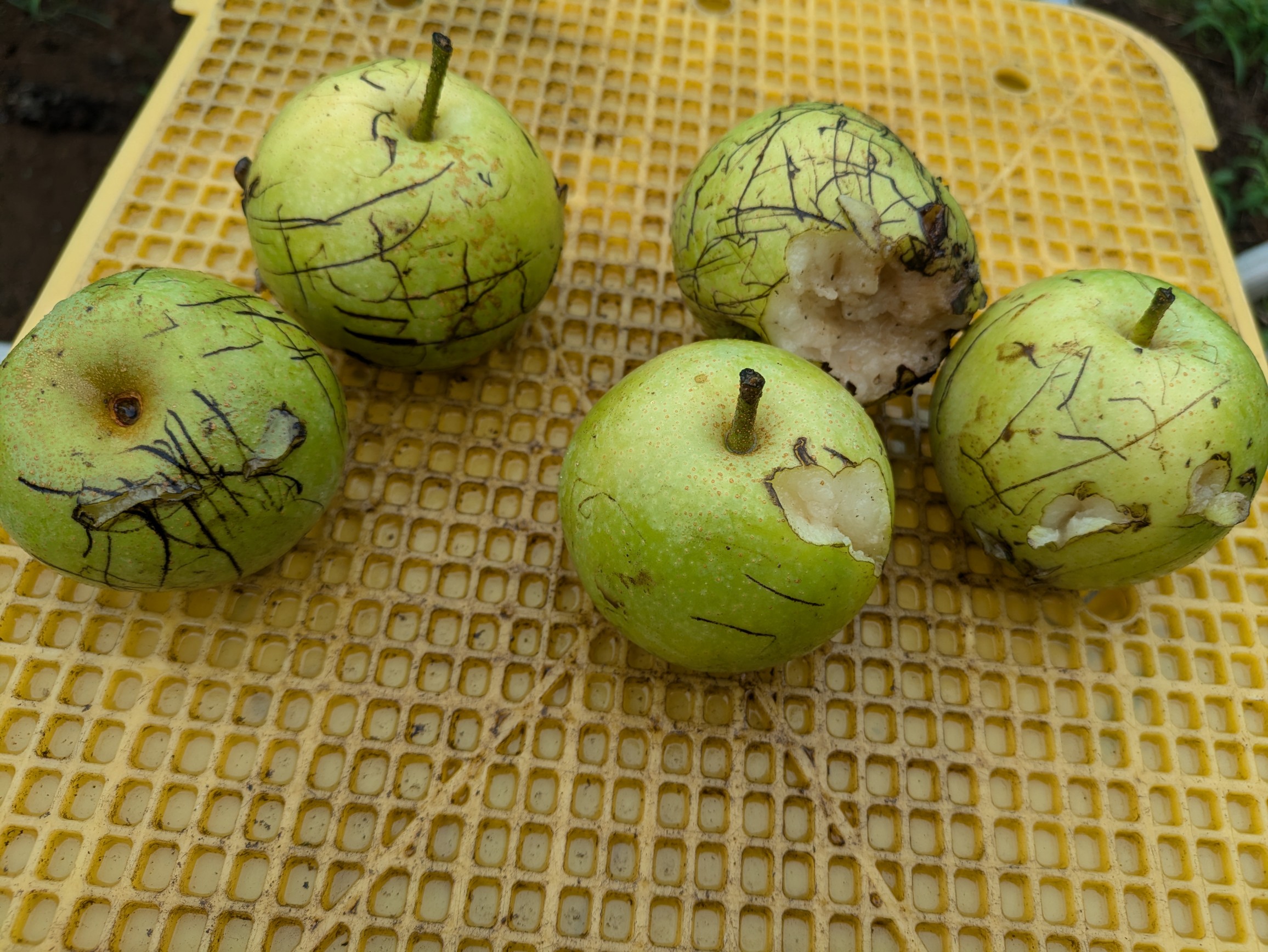 梨が肥大してきて落果が多くなってきました。着果している位置によって、自重に耐えられなくなって落ちてしまいます。ここにきて秋麗だけが獣に食い荒らされています。袋を破き爪で引っ搔いてかじっています。青梨なので袋をかけていますが、袋ごと下に落ちているのもかなりあります。収穫まで1ヶ月以上あるのに何てことをしやがる。