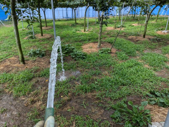 猛暑日が続き雨が降らず、水不足です。第三京浜の都筑インター近くに、組合の井戸がありポンプアップして用水路に水を流して、圃場に引き込み散水しています。明日から台風9号の影響で雨が降りそうですが、降雨量が期待できるでしょうか?台風の進路が気になりますが、風は困ります。水不足で梨は小玉傾向で葡萄も玉張りが今一つです。直売開始日は未定です。梨とブドウの宅配便の受け付けはしていません。
