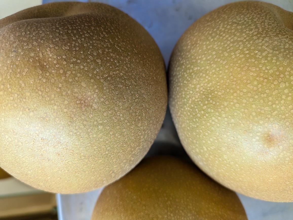 今年の豊水は蜜症が多発しています。今迄は蜜症は、7月の日照不足低温、カルシウム不足が原因と言われてましたが、近年の高温、強い日差しの下で毎年のように蜜症が発生しています。今迄あきづきに発生していた、コルク障害が豊水にも見られるようになりました。外観から分かるようになって、一見カメムシか?と思われるような症状です。温暖化の影響で、豊水は益々作りにくくなってきています。老木がお疲れになったら豊水を伐採して止めようと思っています。