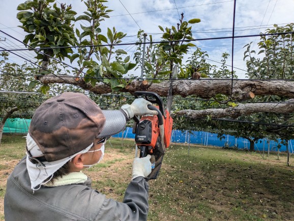 伐採する豊水の枝を4日~6日にかけて切り落とし、今日は主枝、亜主枝の太い部分を伐採しました。根を掘り上げればいいのですが、その前に枝をチッパーで粉砕し、伐採した太い木の処分です。伐採した豊水が健全ならば、3,000個くらいは採れたと思います。年々豊水の収穫量は減ってしまいます。