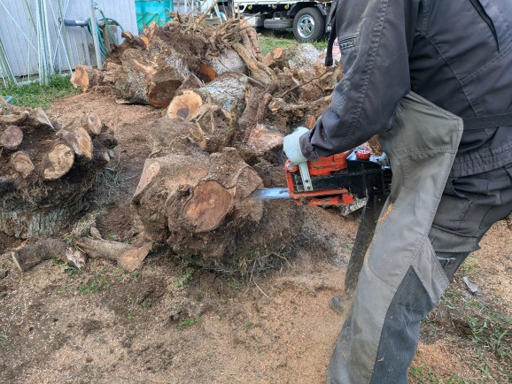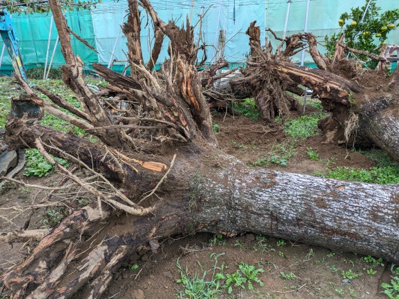 掘り上げた豊水の根から土を落とし、バックホーでくわえてトラックの荷台に積める位の大きさと重さに切りました。根に土が付いている状態で、チェーンソーで切断するとチェーンソーの刃がすぐに切れなくなってしまいます。雨が続き中断していた作業です。