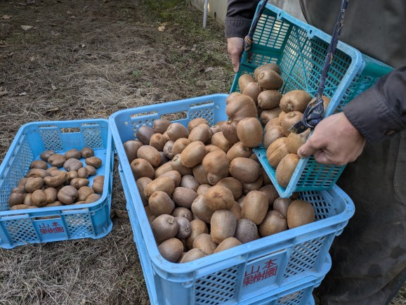 キウイフルーツの収穫を始めました。今年は猛暑と水不足で全体に小さいです。来週半ば位を予定してましたが、糖度を測ってみたら7.5度あったので、収穫には問題なさそうです。ヘイワードの収穫は糖度が7度以上になってからです。圃場ごとに収穫して選果です。
