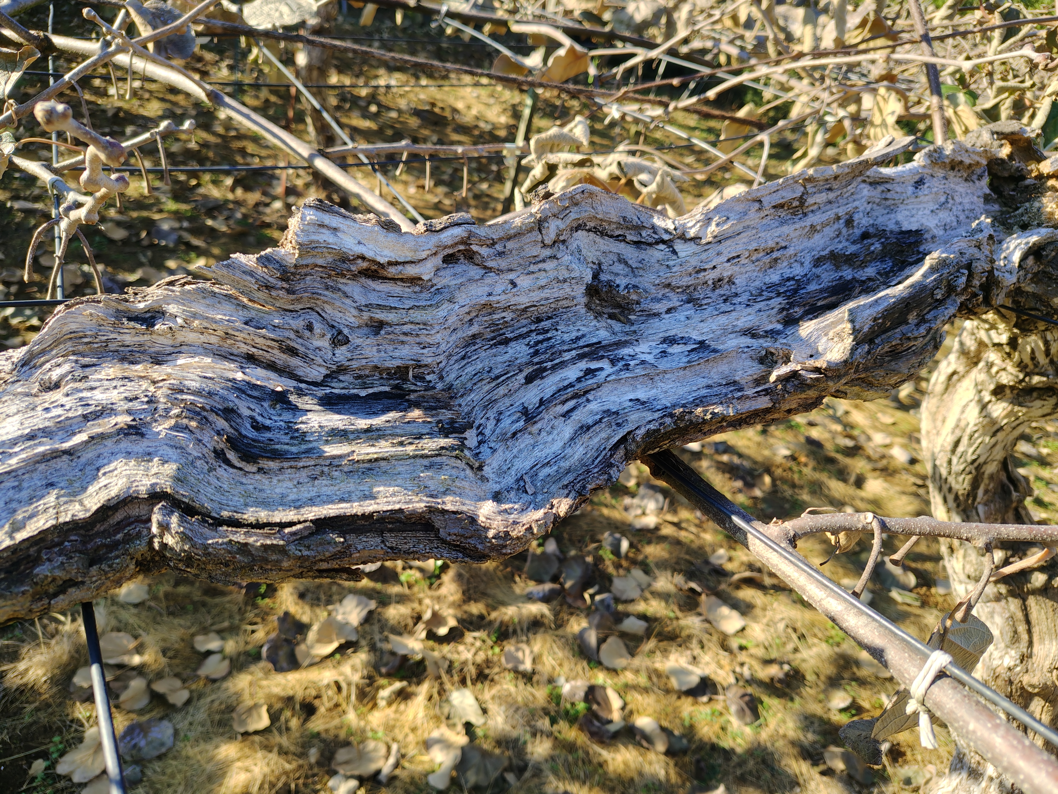 キウイフルーツの香緑とヘイワード4本を掘り上げました。ヘイワードは大きい果実が生らない木、根がモンパ病に侵された木、香緑は老木で半分枯れた状態で大玉は期待できないので伐採、抜根です。香緑ファンのお客様には残念ですが、来年は収穫出来ません。香緑は栽培に難点があるので作りたくない品種です。写真は主枝が殆ど腐って皮1枚で生きている状態の香緑です。