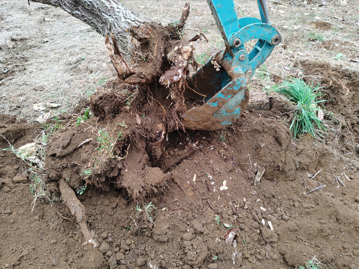伐採してあるキウイフルーツの根を掘り上げました。大玉果実が生らないヘイワードは、モンパ病に侵され根が半分腐っていなした。黄肉で芯の周りが紅い品種のレインボーレッドも大玉が生らないのですが、根は細根がたくさんあり健全な根でした。香緑は老木で主枝が枯れて収穫量が激減したので、伐採抜根です。
