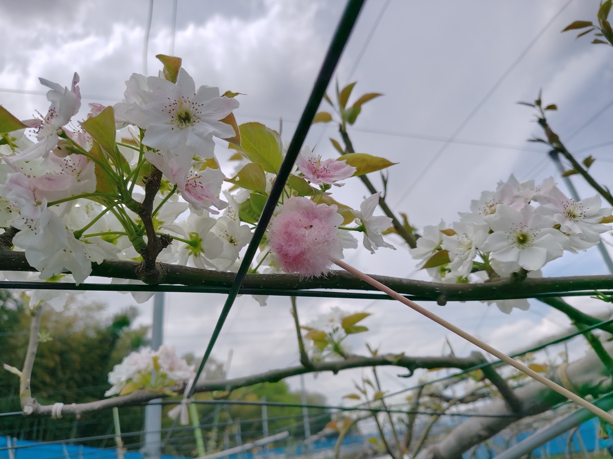 梨の受粉作業を3日に1回目を行い、今日で2回目です。雨の日が多く授粉のタイミングが合わなくて、1回目の日には早く咲いた豊水の花が散り始めていました。今日は成木園の幸水の受粉にグッドタイミングでした。