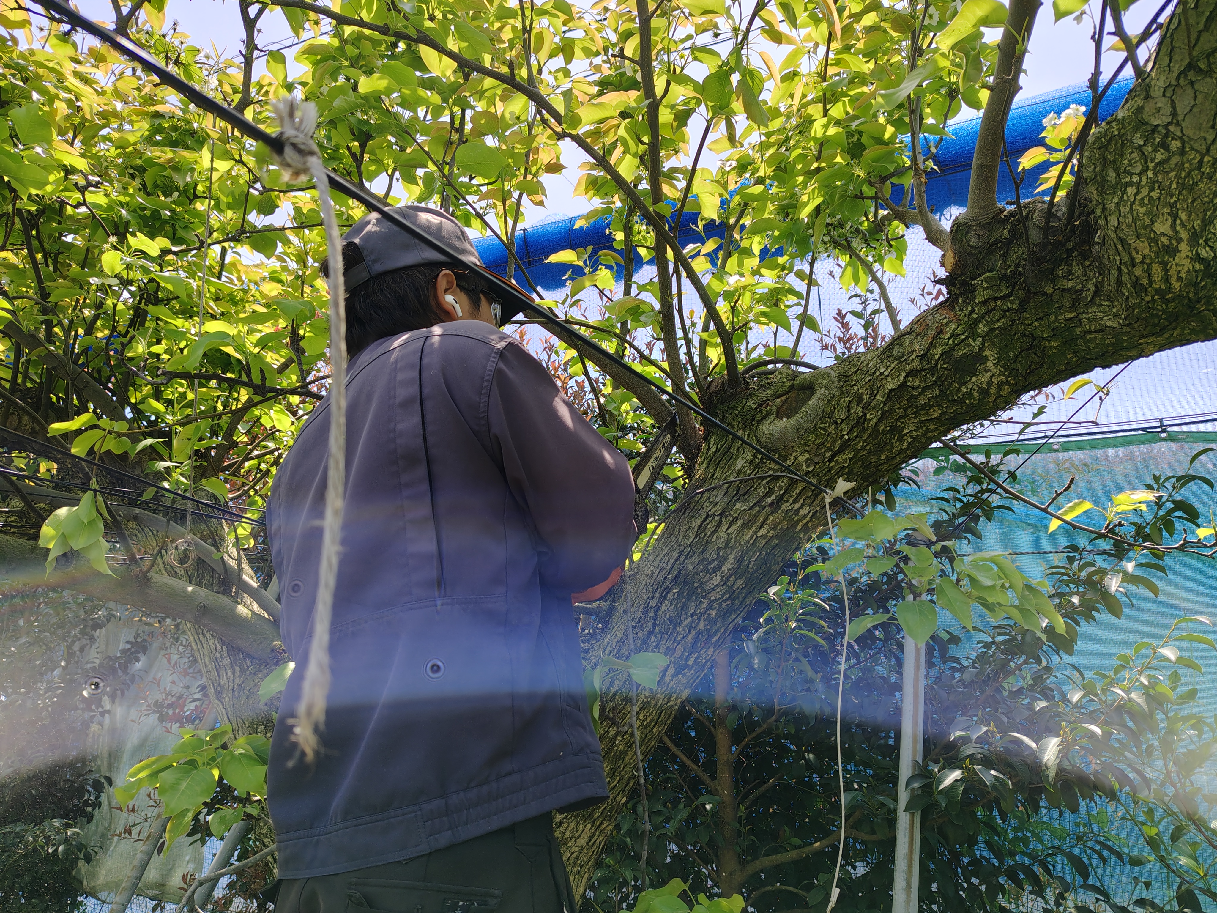 花粉採集を終えた、花粉樹の松島の枝が伸びているので整理しました。花を摘まんでしまうと、来年まで用が無いし枝が伸びていると、天井に張る防鳥網がはれません。これから新梢が伸びて枝が混んでくると、薬剤のかけむらがでて病害虫の巣になりかねません。