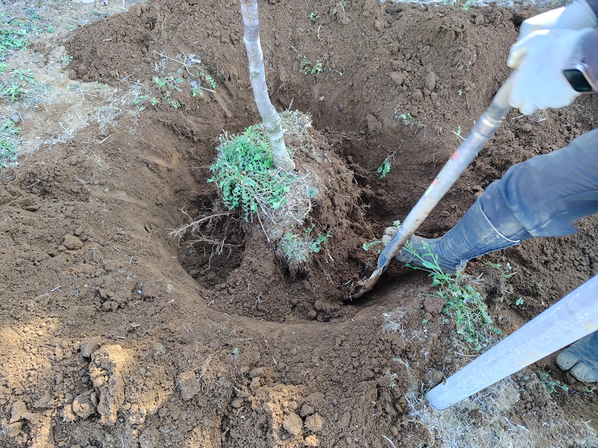 梨の元肥を施し、トラクターでの耕運も終わりました。牧草の種を蒔く前に苗木の植付をしました。昨年購入して圃場の端で1年間育成した苗木(豊水)です。伐採抜根した豊水が、モンパ菌に侵されていたので、モンパ菌に対抗する善玉菌資材を投入してからの植付です。