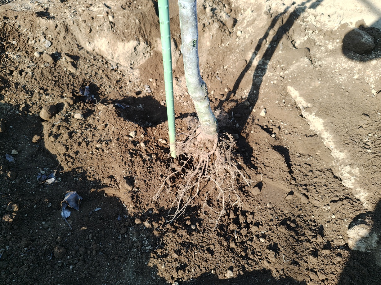 バックホー(ユンボ)で埋戻しが終了しました。施肥の前にモンパ病が疑われる幸水を掘ってみると、根が腐って殆ど残ってない状態でした。残っている根も触るだけでポロポロと崩れるようでした。これだけモンパ菌に侵されると、治療にどんな殺菌剤や資材を投入しても復活は不可能でしょう。写真上、根が腐って殆ど残っていません。下の写真はモンパ菌に侵されて白い菌糸がハッキリ分かります。