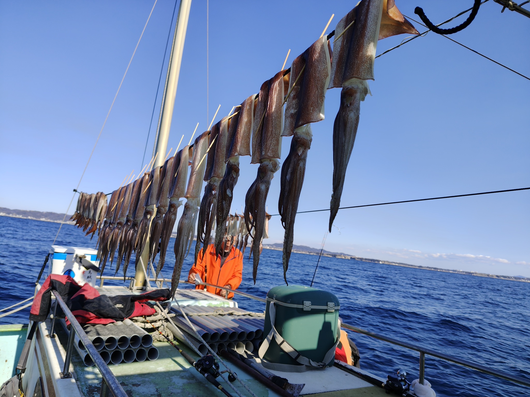 雨が降らずカラカラ天気が続き、お湿りが欲しいところですが、梨の剪定誘引作業は順調に進んでいます。今日は仕事を休み、イカ釣りに行ってきました。今年になって初めて定宿の長井港徳丸です。ヤリイカ2杯と殆どがスルメイカでしたが、今日の釣果はまあまあでした。スルメは釣ったらすぐに開いて船上干しです。