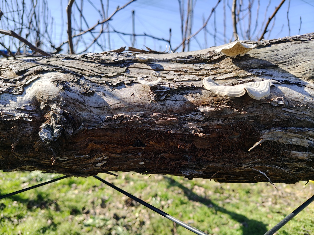 梨の剪定誘引作業は順調に進んでいます。幸水が終了し豊水の成木を始めていますが、老木なので萎縮で腐っていたりシンクイムシが粗皮の下に越冬していたり、キノコがはえてきて切り落とすような所が出てきました。昨年収穫後(10月)に老木を伐採抜根したのですが、葉が付いていたので見逃してしまったようです。